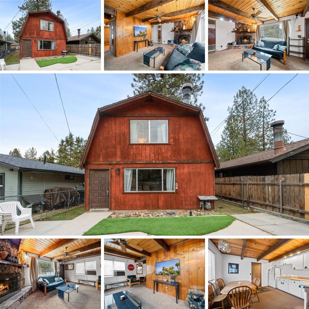 Classic gambrel-style cabin in a peaceful Erwin Lake neighborhood. Features include beamed ceilings, a wood-burning rock fireplace, an eat-in kitchen, and two spacious bedrooms with one bath. The level, fenced lot with concrete parking offers easy access and year-round convenience. A solid investment opportunity in Big Bear.